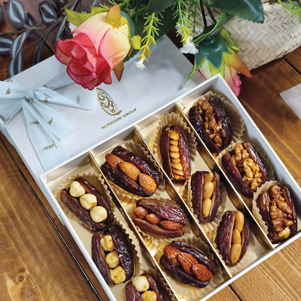 Premium dates filled with almonds, walnuts, hazelnuts and Peanuts.